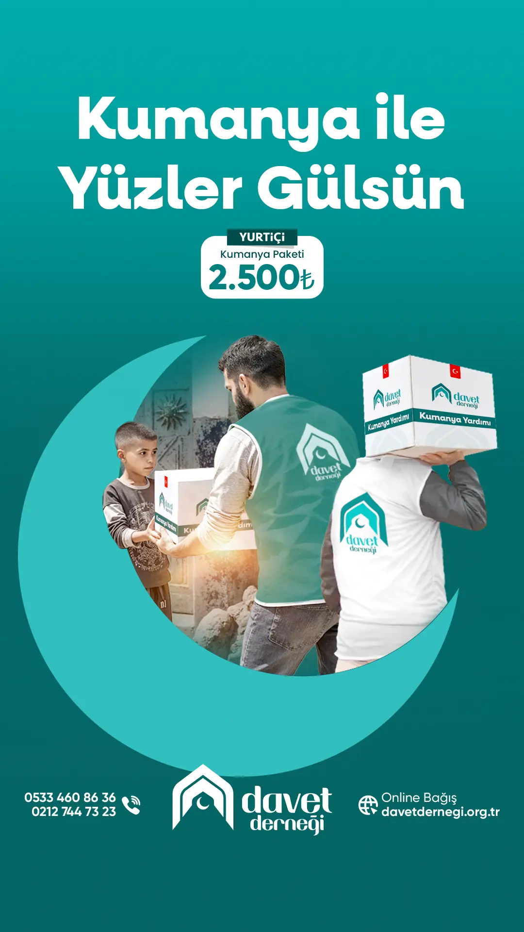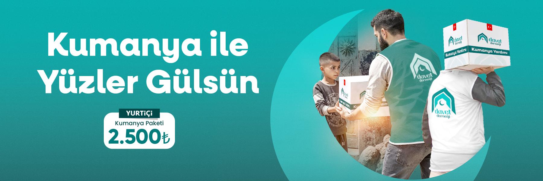 Kumanya bağışı; dayanışmanın, kardeşliğin ve “Komşusu açken tok yatan bizden değildir” hadis-i şerifinin hayata yansıtılmış bir örneğidir. Davet Derneği olarak hazırladığımız kumanyalar, yurt içindeki ihtiyaç sahibi ailelere düzenli olarak ulaştırılmaktadır. Bir kumanya bedeli 2500 TL’dir.Siz de bir kumanya bağışında bulunarak bir ailenin bir aylık temel gıda ihtiyacını karşılayabilir, bu hayır halkasına dâhil olabilirsiniz.